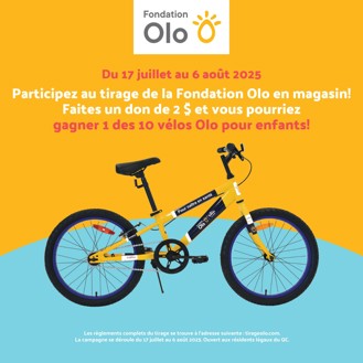 L’été a pris des allures festives avec le lancement d’un concours en magasin, offrant la chance de gagner un vélo à celles et ceux qui faisaient un don à la Fondation Olo. Dix gagnants parcourent maintenant les routes du Québec sur leur tout nouveau vélo aux couleurs d’Olo!