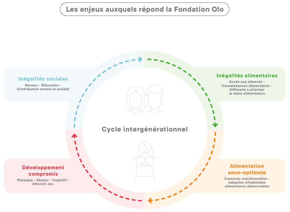 Ainsi, l’impact et le modèle logique de la Fondation Olo reposent sur la compréhension qu’il existe des inégalités alimentaires constituées de trois grandes barrières à la saine alimentation expliquant pourquoi certaines familles ne sont pas en mesure d’offrir une alimentation optimale à leurs tout-petits :